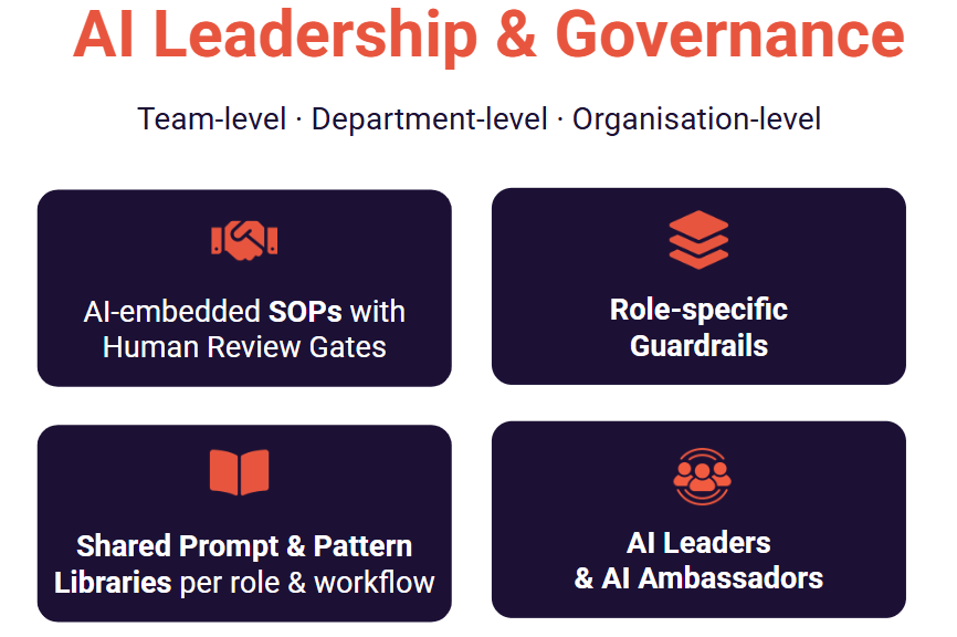 This requires consistent AI Leadership and Governance, to help Engineering Teams adopt AI with shared patterns, specific guardrails, quality control, and human-in-the-loop oversight.